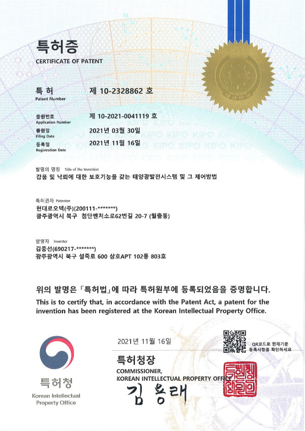 강풍 및 낙뢰에 대한 보호기능을 갖는 태양광발전시스템 및 그 제어방법 특허 > 산업재산권현황