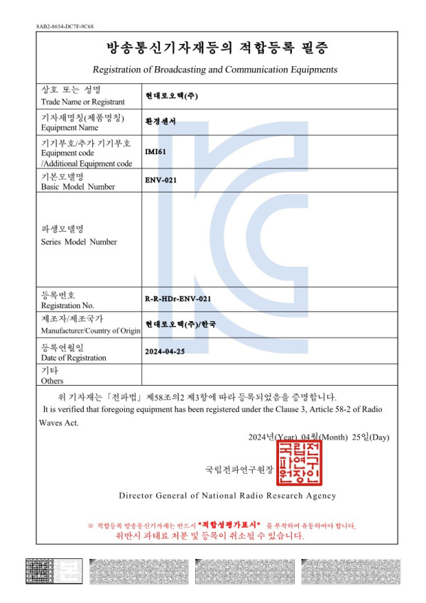 인증서 ENV-021 환경센서_방송통신기자재등의 적합등록필증